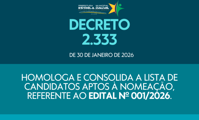 DECRETO Nº 2.333 | Homologa e consolida a lista de candidatos aptos à nomeação, referente ao Edital nº 001/2026.