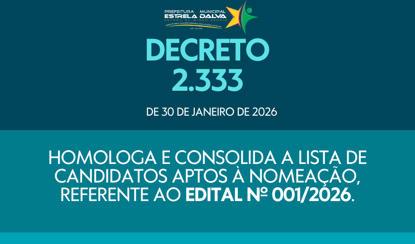 DECRETO Nº 2.333 | Homologa e consolida a lista de candidatos aptos à nomeação, referente ao Edital nº 001/2026. ascom 1 mês atrás Clique aqui para BAIXAR O DECRETO Nº 2.333 de 30/01/2026 (Homologa e consolida a lista de candidatos aptos à nomeação, referente ao Edital nº 001/2026.)